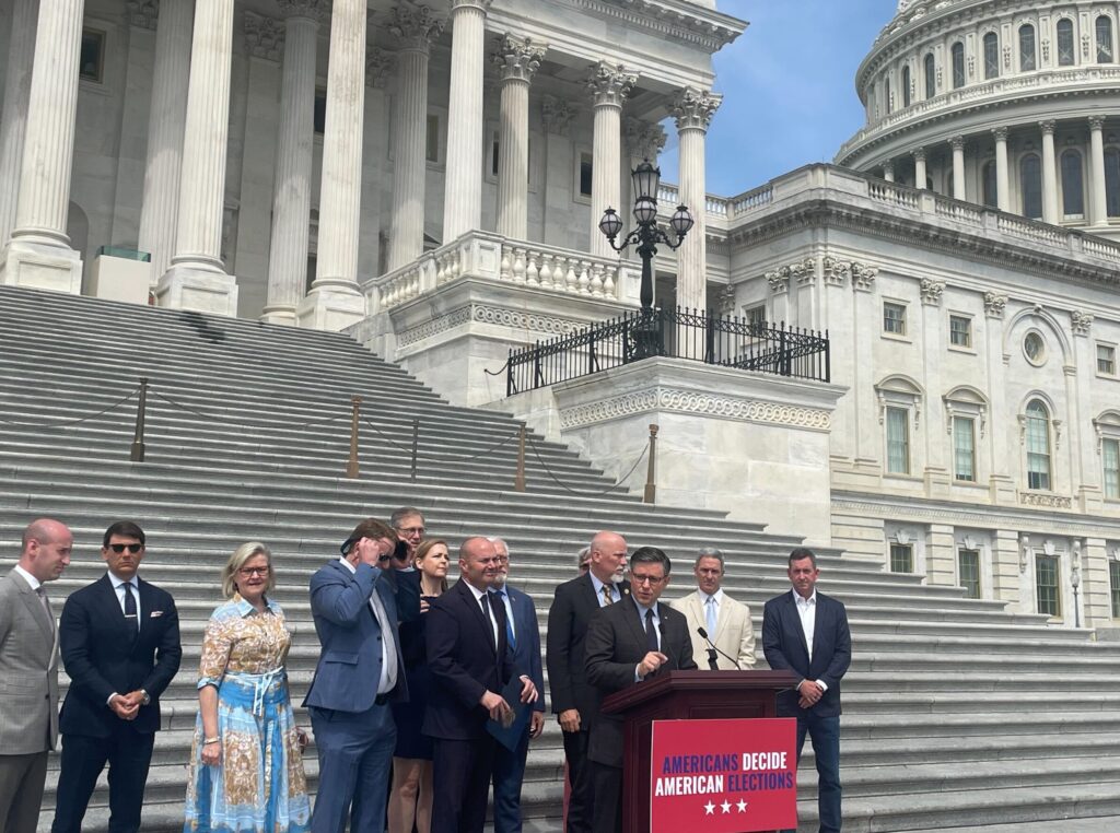 Outside the U.S. Capitol, Johnson was joined by former Trump aides Stephen Miller and Ken Cuccinelli, Tea Party Patriots co-founder Jenny Beth Martin and Cleta Mitchell, a key figure who tried to overturn the 2020 presidential election and is now running a grassroots organization to aggressively monitor elections in November.