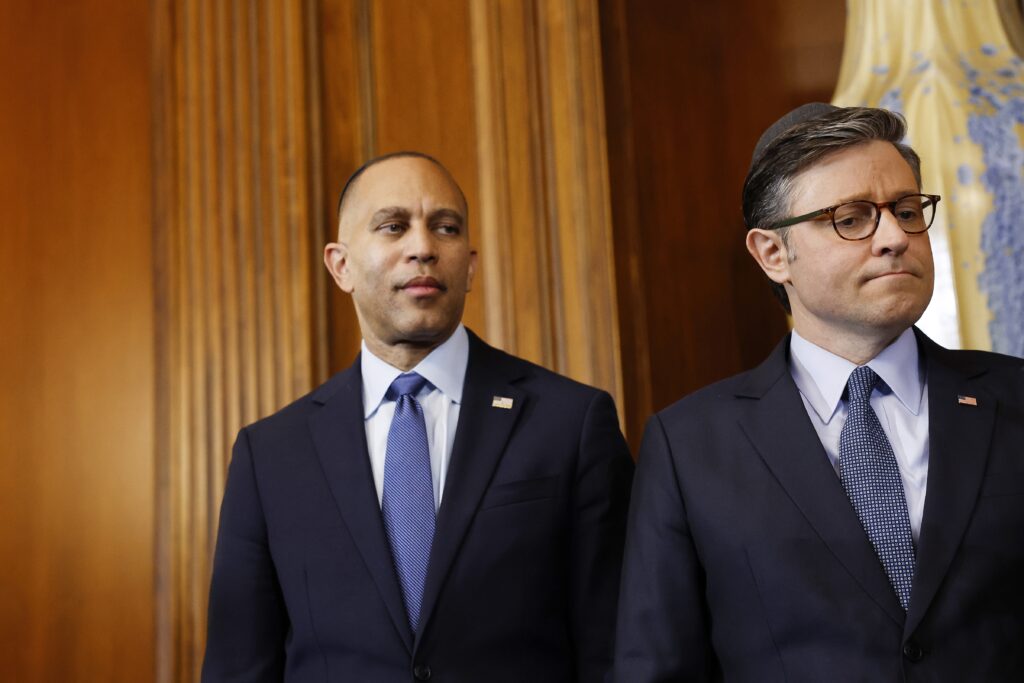 U.S. House Minority Leader Hakeem Jeffries, D-N.Y., left, and U.S. Speaker of the House Mike Johnson, R-La., look on during a menorah lighting ceremony during a Hanukkah reception at the U.S. Capitol Building on Dec. 17, 2024, in Washington, D.C. (Photo by Anna Moneymaker/Getty Images)