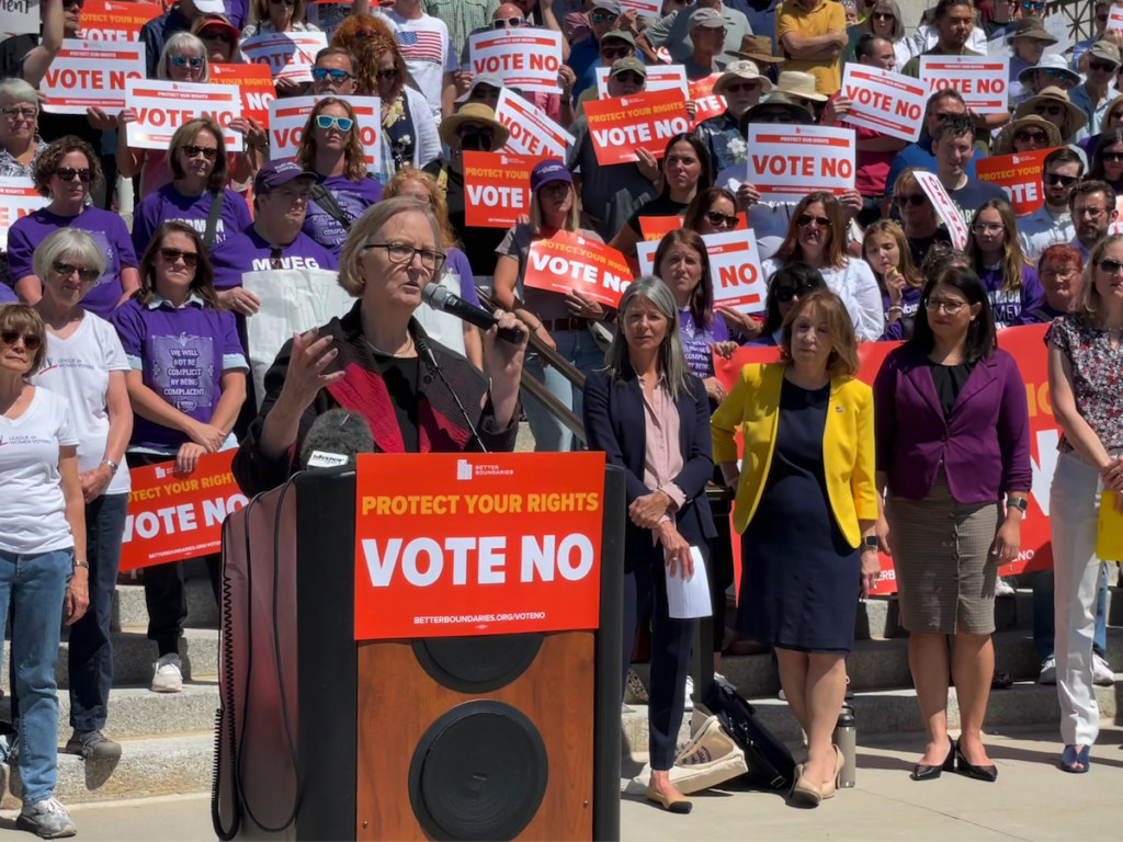 Former Utah Supreme Court justice Christine Durham urges Utah voters to reject a constitutional amendment on ballot initiatives during a rally at the Utah Capitol in Salt Lake City on Aug. 26, 2024. (Katie McKellar / Utah News Dispatch)