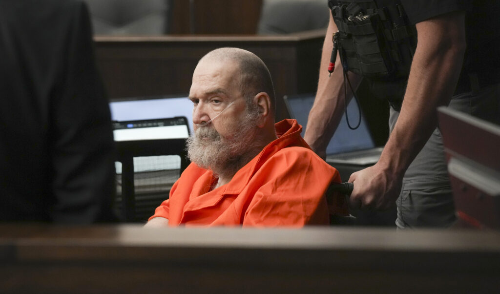 A corrections officer wheels in Ralph Menzies during his commutation hearing before the parole board at the Utah State Correctional Facility in Salt Lake City as he petitions to stop his execution by firing squad on Wednesday, Aug. 13, 2025. (Pool photo by Bethany Baker/The Salt Lake Tribune)