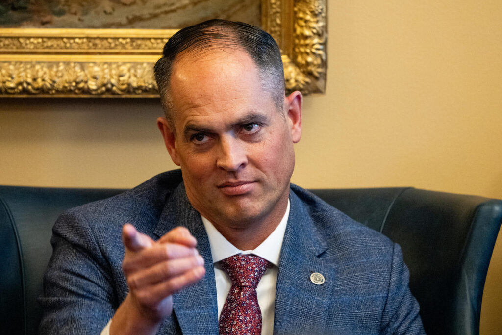 Senate Majority Assistant Whip Mike McKell, R-Spanish Fork, talks with reporters during a press conference with Senate leadership at the Capitol in Salt Lake City on the first day of the legislative session, Tuesday, Jan. 21, 2025. (Photo by Spenser Heaps for Utah News Dispatch)