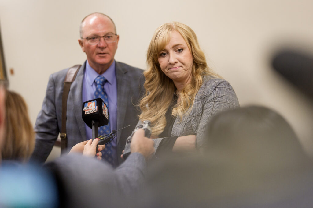 Sen. Scott Sandall, R-Tremonton, and Rep. Candice Pierucci, R-Riverton, talk to reporters after a meeting of the Utah Legislative Redistricting Committee during a special legislative session at the Capitol in Salt Lake City on Monday, Oct. 6, 2025. (Photo by Spenser Heaps for Utah News Dispatch)