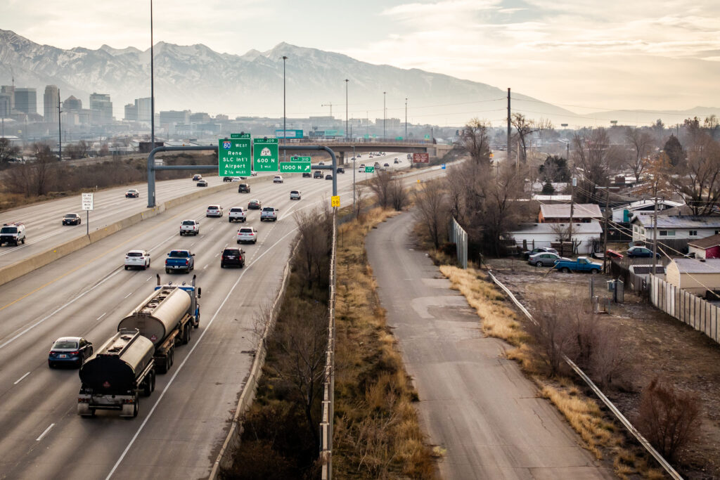 Traffic moves along I-15 near neighborhoods in the Rose Park neighborhood of Salt Lake City on Wednesday, Jan. 3, 2024. (Photo by Spenser Heaps for Utah News Dispatch)