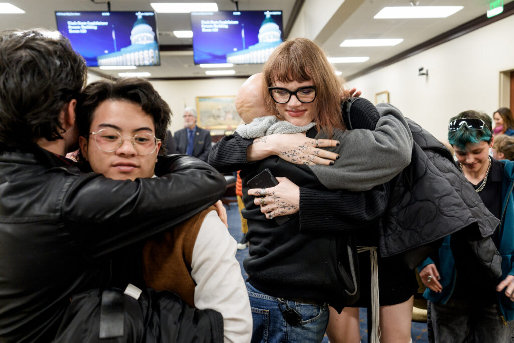 Benjamin and Cyrus Espiritu, left, and Michael Massimi and his daughter Blaire celebrate after HB193 failed in the Senate Business and Labor Standing Committee, at the Capitol in Salt Lake City on Thursday, Feb. 19, 2026. The bill would have banned government entities from using public funds to pay for insurance coverage for transgender employees who receive hormonal treatments or sex characteristic surgical procedures. (Photo by Spenser Heaps for Utah News Dispatch)