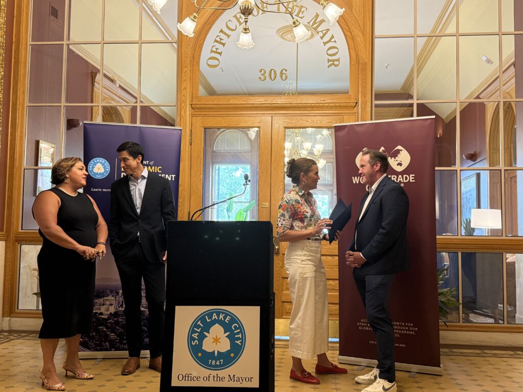 Salt Lake City leaders announce the transfer of the municipality’s Foreign Trade Zone grantee authority to World Trade Center Utah. Pictured from left to right, Salt Lake City Council member Victoria Petro; World Trade Center Utah CEO Jonathan Freedman, Salt Lake City Mayor Erin Mendenhall and Director of the Governor’s Office of Economic Opportunity Jefferson Moss. (Alixel Cabrera/Utah News Dispatch)