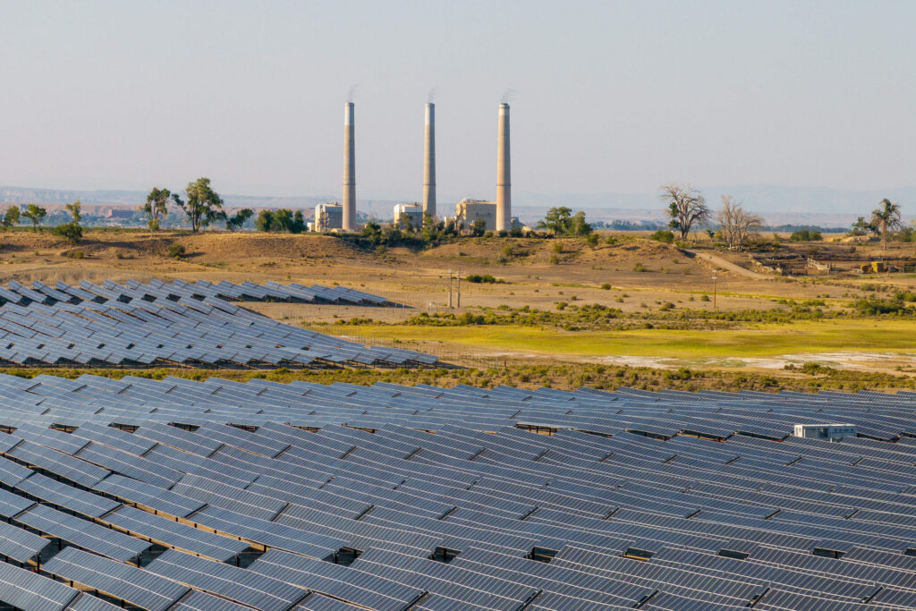 A solar installation in Emery County, with PacifiCorp’s Hunter coal-fired power plant in the background, is pictured on Wednesday, July 31, 2024. (Photo by Spenser Heaps for Utah News Dispatch)