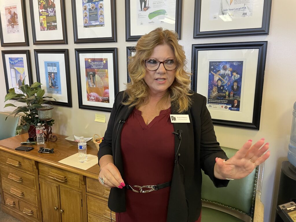 Renée Pinkney, president of the Utah Education Association, talks with reporters after a press conference at the Utah PTA offices announcing a campaign urging Utah voters to reject constitutional Amendment A. (Katie McKellar / Utah News Dispatch)