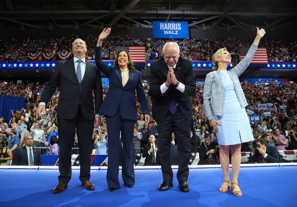 Left to right, second gentleman Doug Emhoff, Democratic presidential candidate, U.S. Vice President Kamala Harris, Democratic vice presidential candidate Minnesota Gov. Tim Walz and his wife Gwen Walz greet supporters during a campaign rally at the Liacouras Center at Temple University on August 6, 2024 in Philadelphia, Pennsylvania. (Photo by Andrew Harnik/Getty Images)