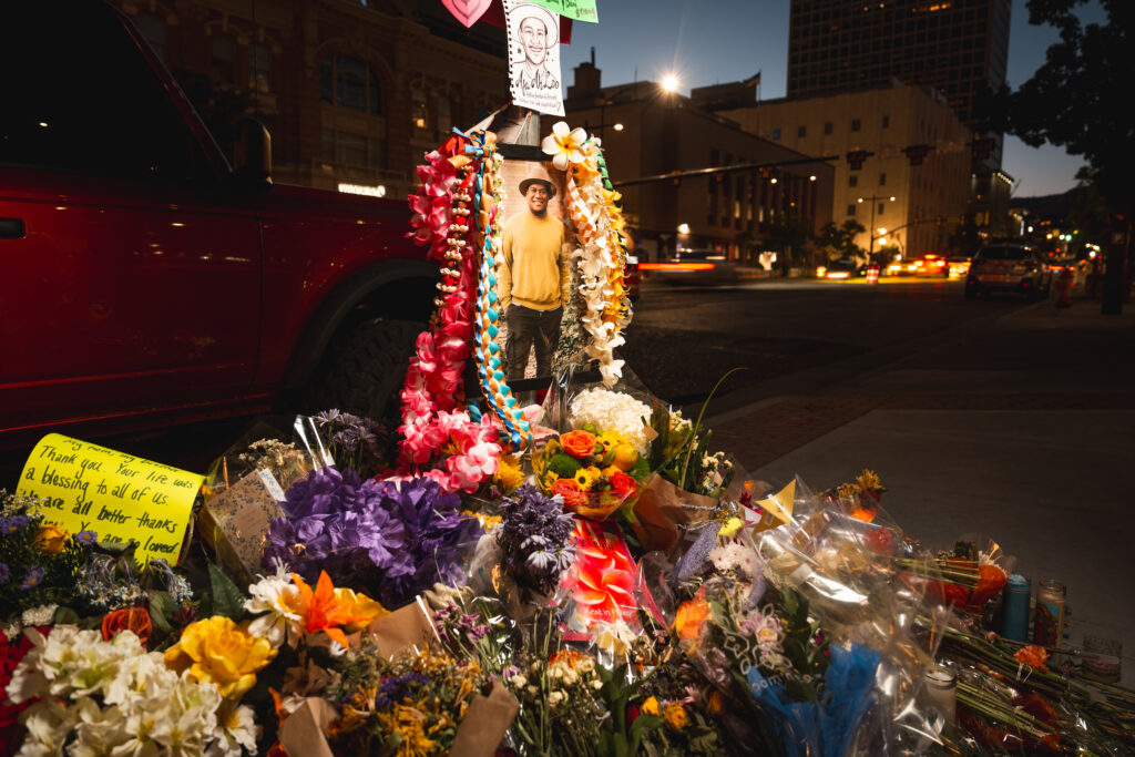 Flowers and pictures are left at a memorial to Arthur “Afa” Ah Loo, Wednesday, June 18, 2025, at the site where he was shot and killed at the “No Kings” protest on State Street in Salt Lake City. (Photo by Spenser Heaps for Utah News Dispatch)