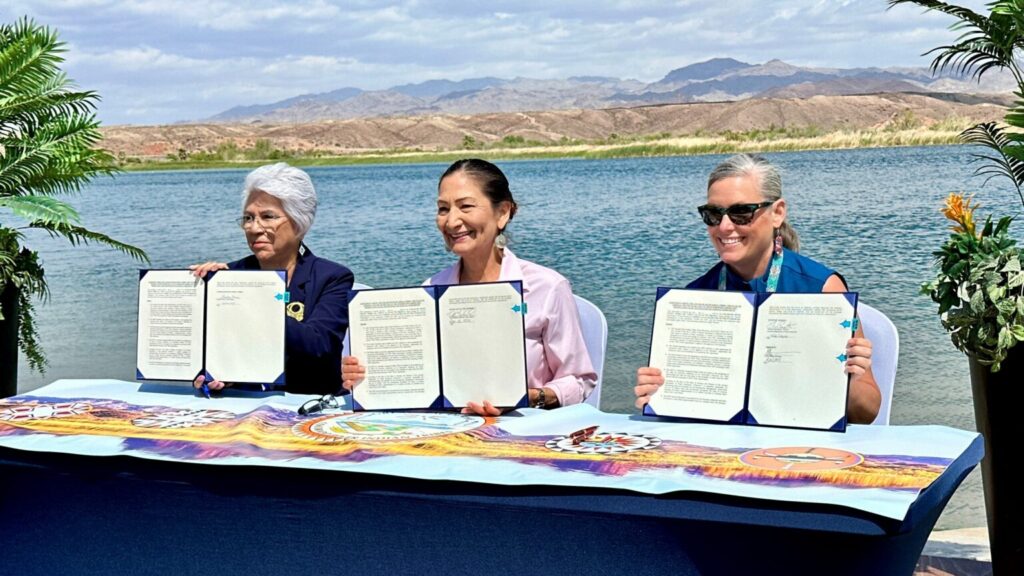 Colorado River Indian Tribes Chairwoman Amelia Flores, Interior Secretary Deb Haaland, and Arizona Gov. Katie Hobbs signed the final documents for the tribe’s water rights settlement on April 26, 2024. The settlement is part of the Colorado River Indian Tribes Resiliency Act of 2022. (Shondiin Silversmith/Arizona Mirror)