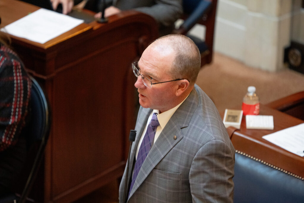 Sen. Scott Sandall, R-Tremonton, speaks on the Senate floor at the Capitol in Salt Lake City on Thursday, Feb. 6, 2025. (Photo by Spenser Heaps for Utah News Dispatch)